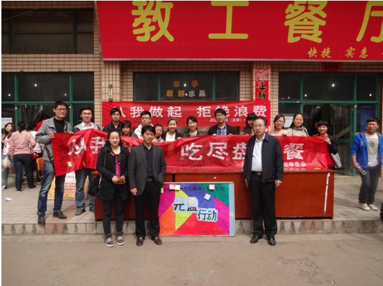 的各位老师来到活动现场,并在倡议横幅上签名,与同学们合影留念,并身体力行,与同学们一同就餐,以实际行动倡导节俭、反对浪费。