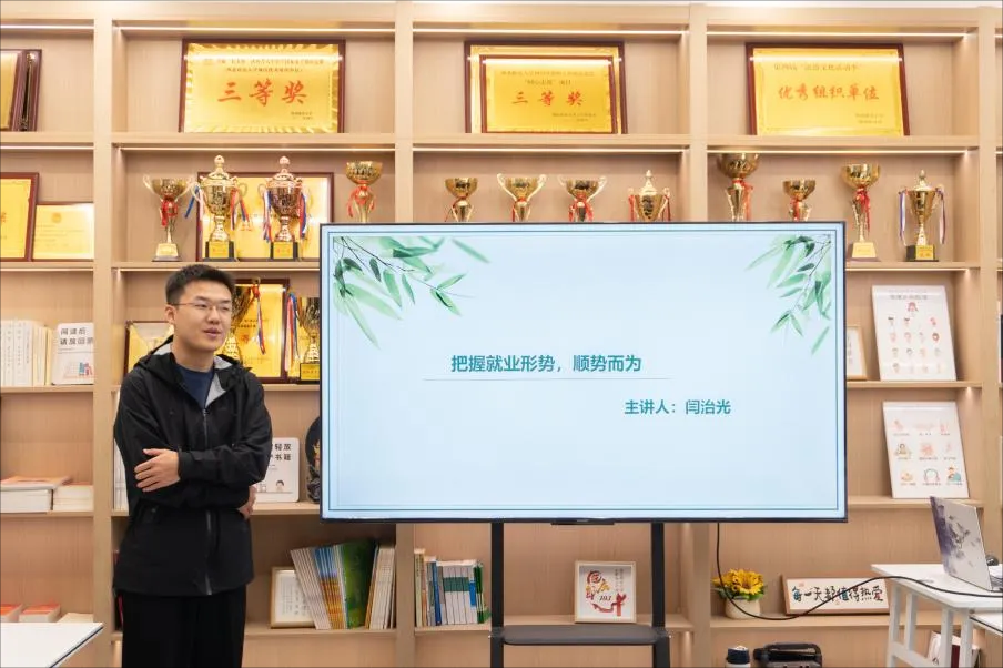 宣讲人闫治光分享的主题是“把握就业形势,顺势而为”,他以就业形势,如何顺势与如何作为展开。在宣讲中,闫治光以自身参加的各类招聘会为例,分析当前就业形势,提醒大家要有紧迫感。他将顺势分为顺心势和顺情顺,在择业中将兴趣和志相结合、个人能力和就业环境相结合,及时调整规划适应未来之变。最后,在作为上,他建议大家积极参与各类竞赛、科研项目,以此来丰富自己的简历和经验;同时,要注重软技能的培养,如沟通能力、团队协作能力等,这些都是职场中不可或缺的重要素质。