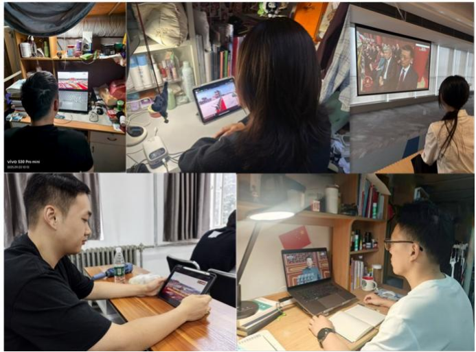 师生观看直播后,心潮澎湃、反响热烈。大家纷纷表示,阅兵式恢宏壮观、震撼人心,充分展现了祖国的强大力量和人民的团结自信。要深入学习习近平总书记在纪念中国人民抗日战争暨世界反法西斯战争胜利80周年大会上的重要讲话,铭记历史,缅怀先烈,珍爱和平,开创未来,传承和弘扬伟大抗战精神,把个人的理想熔铸于国家命运,踔厉奋发、勇毅前行,为实现中华民族伟大复兴贡献自己的青春力量。