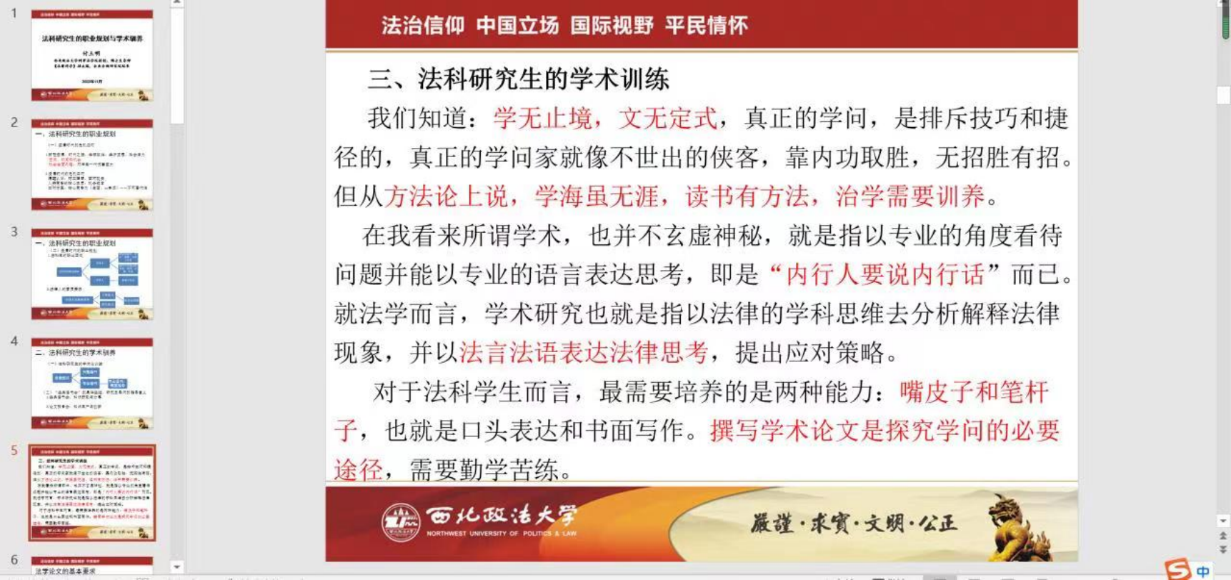 首先,付玉明教授讲述了在当前疫情形势之下,法科研究生面对着巨大的学习压力、社会压力以及各方面的竞争压力,针对此情况,指出法科研究生要不断提升自己的核心竞争力,并对核心竞争力的内涵以及提升核心竞争力的方法进行了详细的说明,希望同学们做好自己的人生规划、职业选择,确定自己的未来方向,在老师的辅助下走好自己的人生之路。
