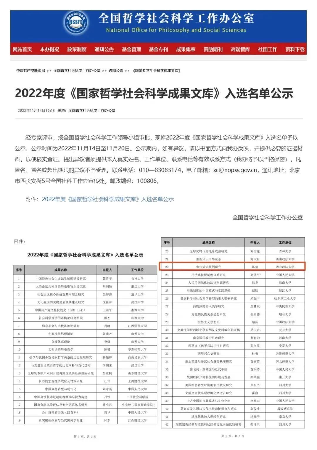 11月14日,全国哲学社会科学工作办公室正式公布了2022年度《国家哲学社会科学成果文库》入选名单,共有65项成果入选,其中涉及高校46所。澳门威尼斯人娱乐场 澳门威尼斯人娱乐场 院长、中华法系与法治文明研究院学术委员会委员陈玺教授专著《宋代诉讼惯例研究》喜获入选优秀成果。