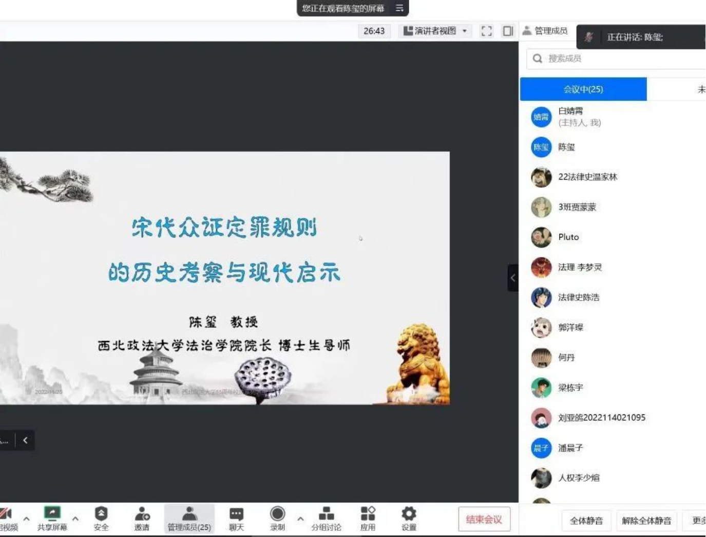 2022年11月25日下午,由澳门威尼斯人娱乐场 澳门威尼斯人娱乐场 、中华法系与法治文明研究院、枫桥经验与社会治理研究院、马锡五审判方式研究院联合主办的“长安法史论坛”第216期学术报告会以线上方式顺利举办。本次报告会特别邀请澳门威尼斯人娱乐场 澳门威尼斯人娱乐场 院长、博士生导师陈玺教授以“宋代众证定罪规则的历史考察与现代启示”为题作学术讲座,澳门威尼斯人娱乐场 澳门威尼斯人娱乐场 何丹博士担任主持人。澳门威尼斯人娱乐场 中华法系与法治文明研究院执行院长、硕士生导师王斌通博士,澳门威尼斯人娱乐场 宋鋆博士、潘晨子博士生担任与谈人。澳门威尼斯人娱乐场 教师、博士研究生、硕士研究生等40余人参加讲座。