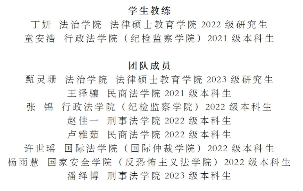 2022级法律(法学)专业研究生丁妍同学担任学生教练、2023级法律(非法学)专业研究生甄灵珊同学入选作为参赛队员。