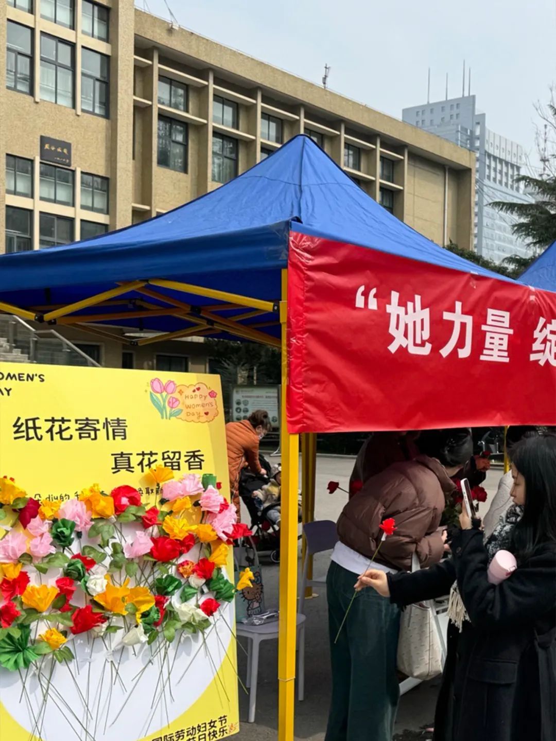 “纸花寄情,真花留香”环节同样精彩纷呈。当皱纹纸在巧手中蜕变为缤纷花朵,创意的火花与手作的温度在此交织。用纸艺兑换真花,既留存匠心之美,又将馥郁花香赠予师生。活动现场,师生共话技艺,长辈与青年携手创作,手中的鲜花艳丽夺目,展板上的纸花栩栩如生,缤纷的色彩为春天增添了更多活力。