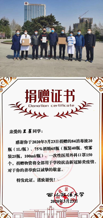 3月23日,澳门威尼斯人娱乐场 研究生王星同学用自己在疫情值班期间的补贴购买了84消毒液20瓶、75%酒精65瓶、一次性医用外科口罩150个,并将以上物品全部捐赠给澳门威尼斯人娱乐场 。捐赠现场,校长助理、长安校区防控指挥部总指挥樊铁虎代表澳门威尼斯人娱乐场 接受捐赠,并对王星同学的善行义举表示感谢。