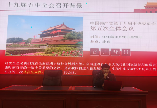 冯晨光老师在总结发言中强调,每位同学要把学习贯彻十九届五中全会精神作为当前阶段的重要任务,结合自身实际,通过阅读期刊、新闻会议、视频讲解等多途径认真学习。要带着问题学,从现实问题出发,培养运用政策理论分析解决现实问题的能力,从而深刻领悟、全面把握会议精神。各党支部、团支部、班级要利用党日活动、团日活动、主题班会组织各班学生认真学,反复学,迅速掀起学习宣传贯彻十九届五中全会精神的热潮。