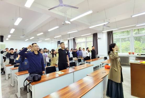 会议第二项,副书记李昕颖、组织委员林生爵、宣传委员尚乐妍、纪检委员杨宇航结合负责领域分别介绍相关情况。随后,新加入党员逐一作自我介绍。全体党员面向党旗宣誓,副书记李昕颖领誓。