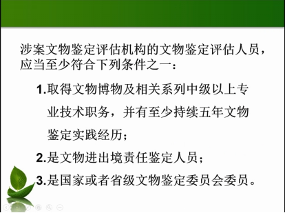 第二部分讲述了涉案文物鉴定与实践,首先通过列举相关法律的规定展示了文物犯罪的类型,其次讲述了涉案文物的鉴定规定以及对鉴定人员资质的要求,更加地突出了文物鉴定专业性强的特征。